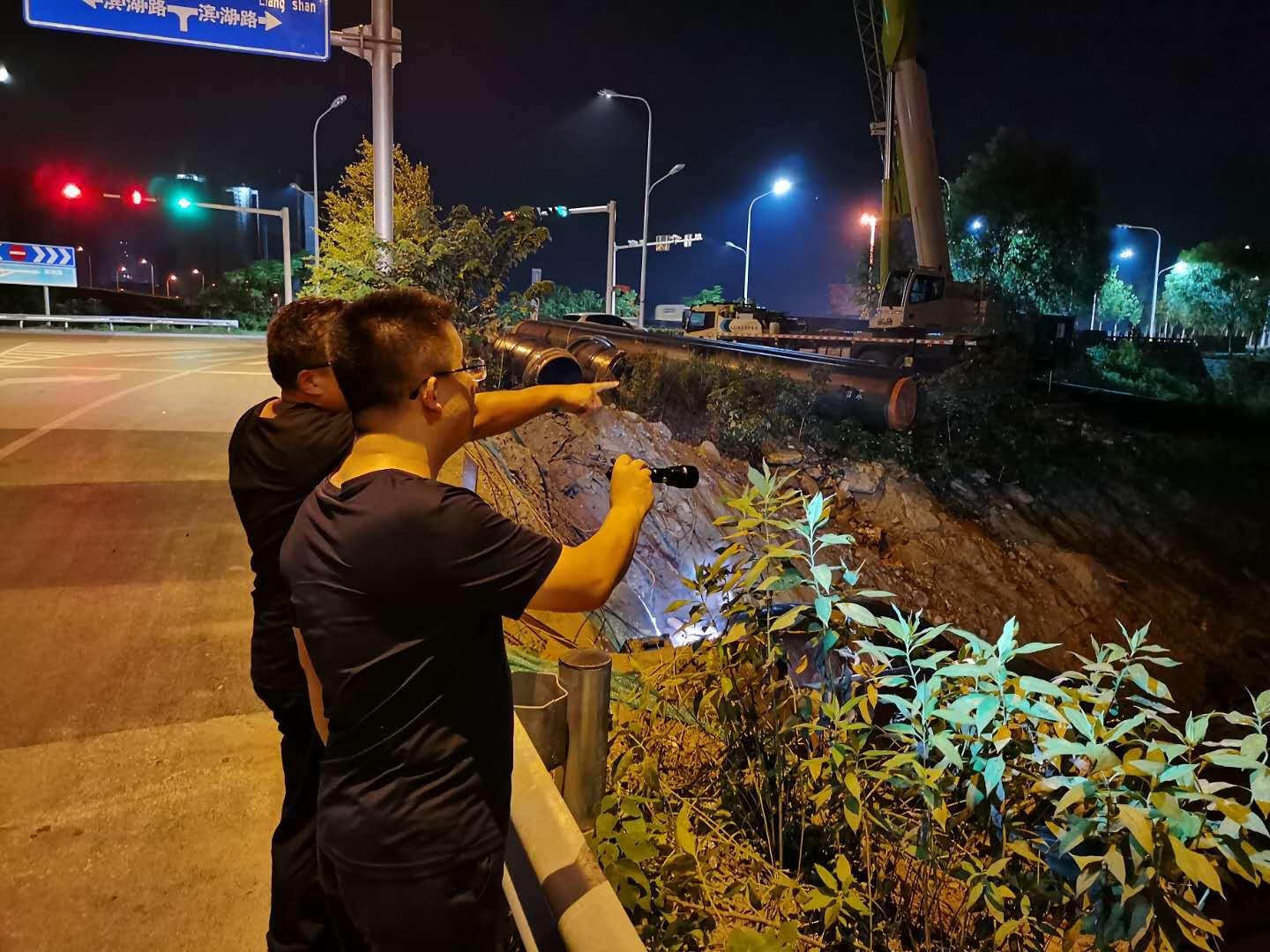 鄧剛先后視察了管網(wǎng)施工第六標(biāo)段、頂管過地表水超采、頂管過火頭灣大橋、頂管過S321公路等5處頂管施工現(xiàn)場。時(shí)至23:40分,在頂管過南躍進(jìn)溝工作井施工現(xiàn)場,數(shù)名施工人員挑燈夜戰(zhàn),正進(jìn)行頂管軌道焊接安裝和設(shè)備調(diào)試工作,夜燈下的身影在工地上來往奔波,現(xiàn)場到處是搶抓工期的干勁與熱情。