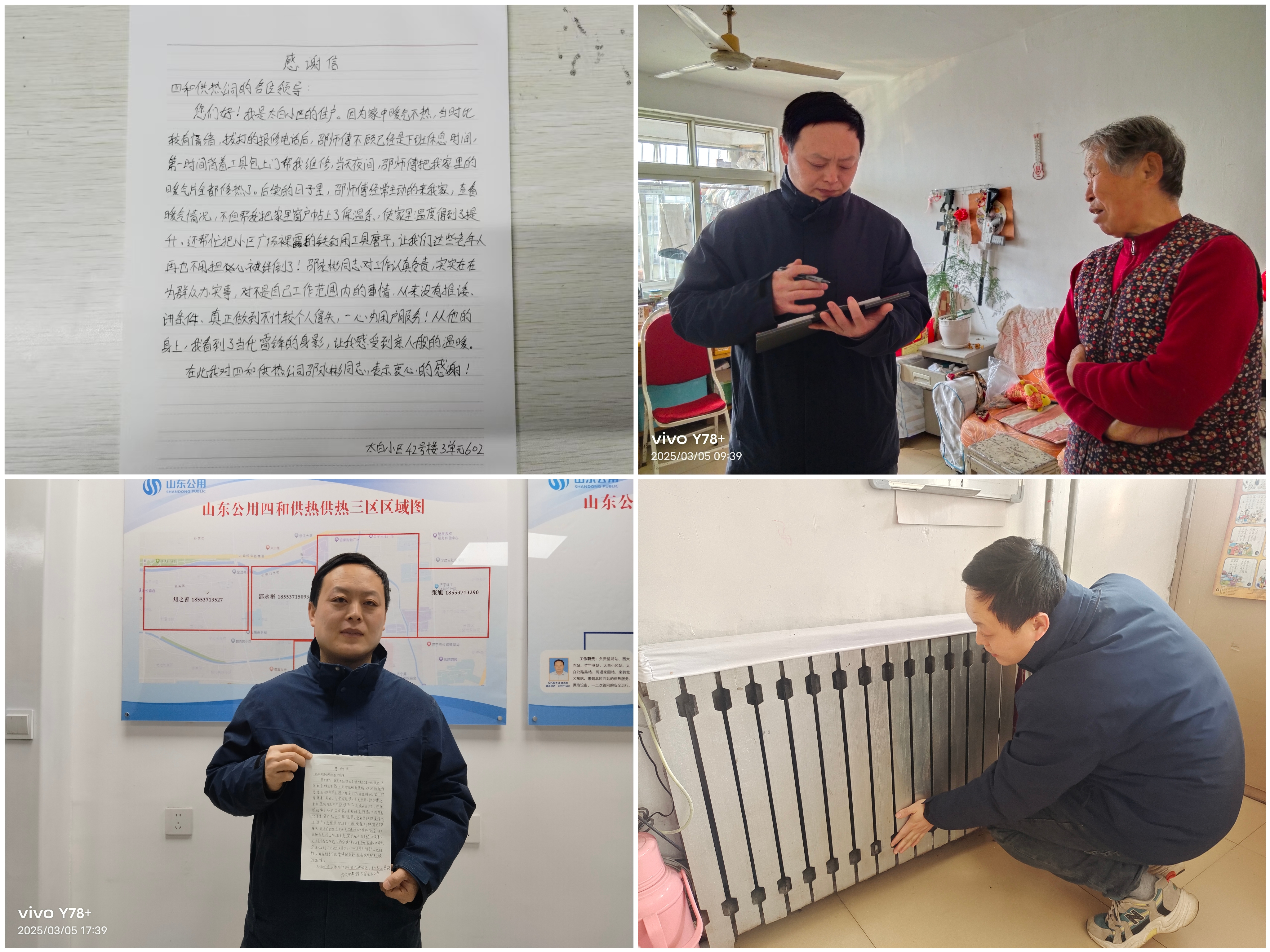 去年冬季深夜,正當(dāng)值班的邵永彬接到用戶的求助電話,他了解情況后,第一時間趕到用戶家中,經(jīng)全面仔細排查,發(fā)現(xiàn)是由于氣堵造成個別暖氣片冷熱不均,找出癥結(jié)后,對臟堵暖氣片進行全面沖洗并更換過濾網(wǎng),經(jīng)過悉心調(diào)試,用戶暖氣片迅速恢復(fù)正常散熱。也是自那日起,邵永彬了解到這位用戶是常年獨居,兒女都不在身邊,因此,他不但時刻關(guān)注家中的暖氣情況,更是主動幫助用戶解決生活中遇到的難心事、煩心事。邵永彬熱情服務(wù)、積極回應(yīng)的態(tài)度、對待用戶始終如一的精神令用戶深切感受到四和供熱人的專業(yè)和熱忱。